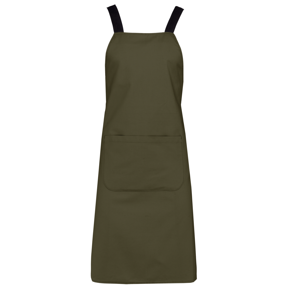 100% coton biologique. Tissu canvas très résistant. Sangles d'attache en coton chevron croisées dans le dos et passant dans des oeillets métal à la taille. Poche devant L 30 cm - H 20 cm. Dimensions: H 90 cm - L 76 cm. Ce produit a subi un traitement spéc
