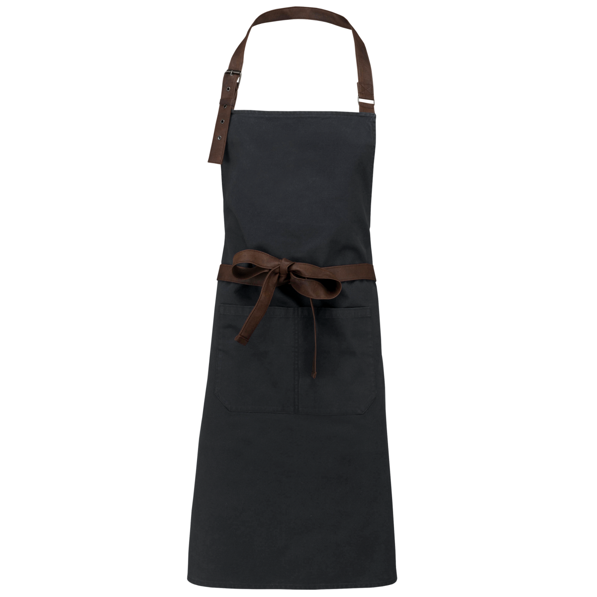 100% coton. Tissu canvas. Boucle de réglage en métal avec illets au niveau du cou pour ajuster la longueur du tablier. Sangles d'attache en tissu fantaisie enduit. Grande poche devant en deux compartiments. Dimensions : H 90 cm - L 76 cm. Poche : H 20 cm
