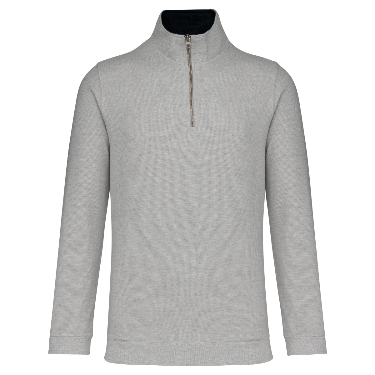 80% coton / 20% polyester. Maille piquée. Col zippé. Intérieur col et parementure contrastés. Bord-côte 1x1 au bas des manches et au bas du vêtement.