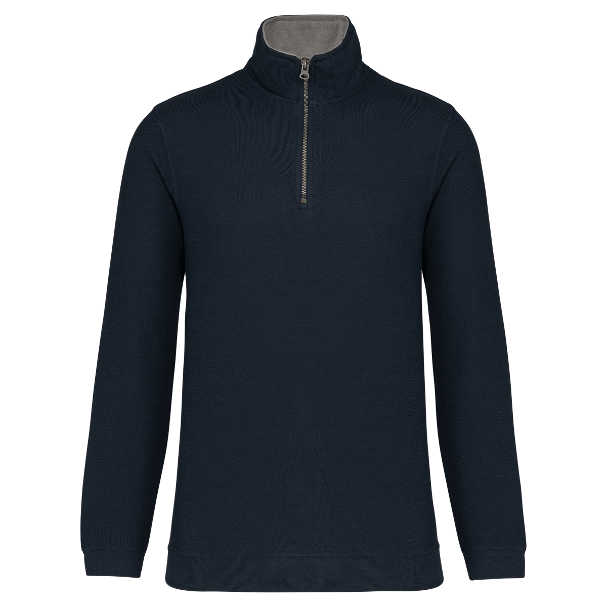 80% coton / 20% polyester. Maille piquée. Col zippé. Intérieur col et parementure contrastés. Bord-côte 1x1 au bas des manches et au bas du vêtement.