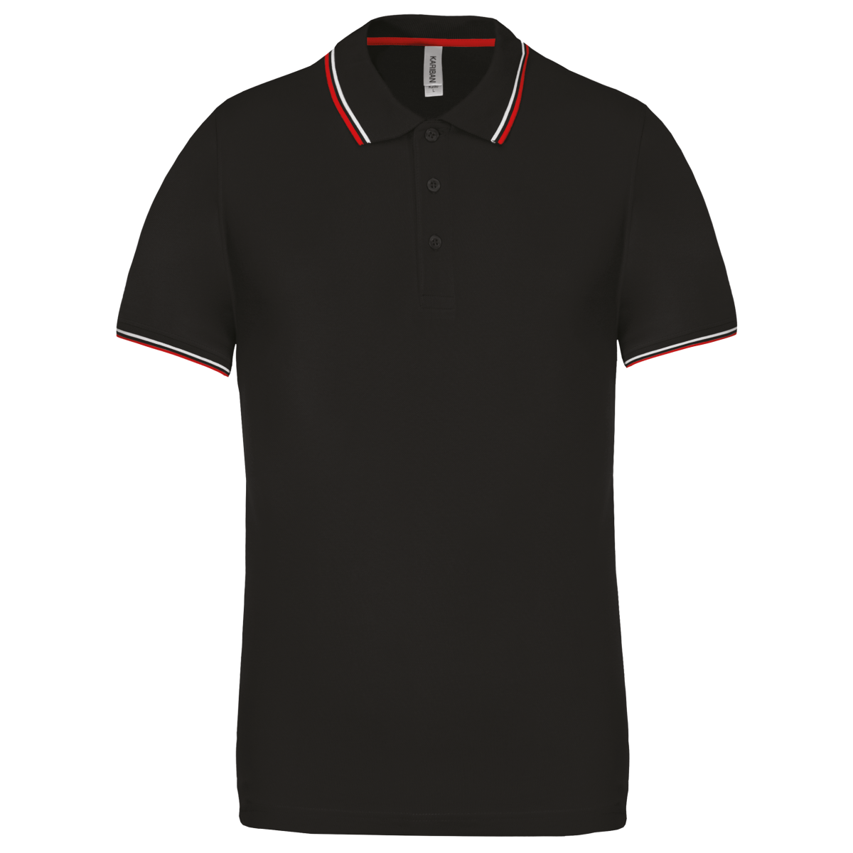 100% coton piqué. Patte de boutonnage col 3 boutons. Bande de propreté contrastée encolure et fentes côtés. Finitions bord-côte avec liserés contrastés col et bas de manches. Double aiguille bas de vêtement.