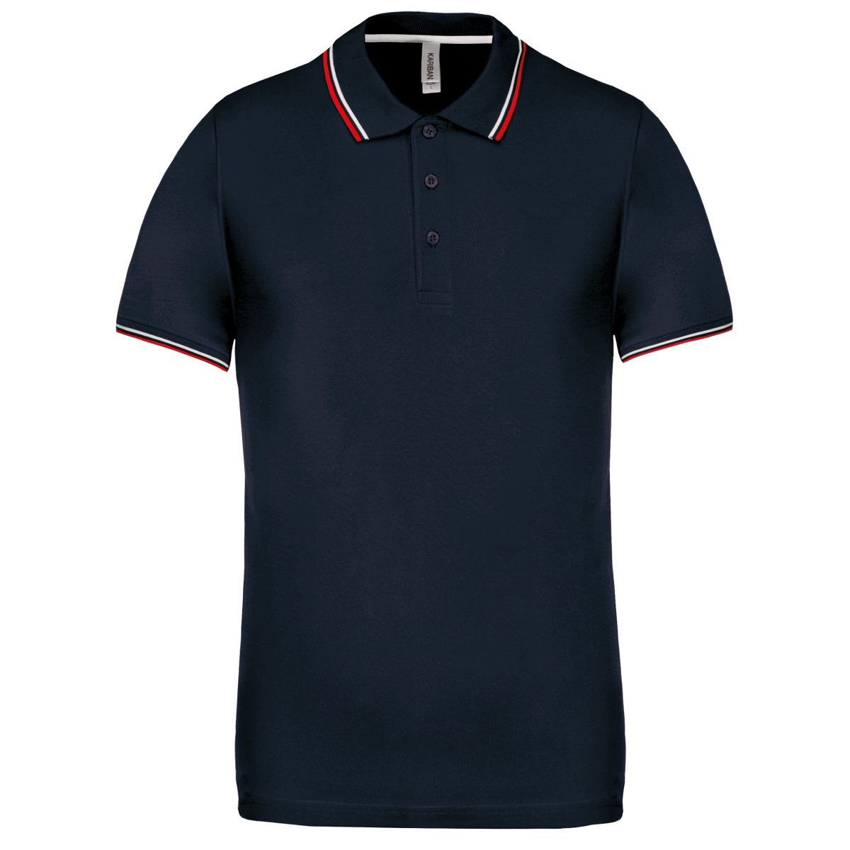 100% coton piqué. Patte de boutonnage col 3 boutons. Bande de propreté contrastée encolure et fentes côtés. Finitions bord-côte avec liserés contrastés col et bas de manches. Double aiguille bas de vêtement.